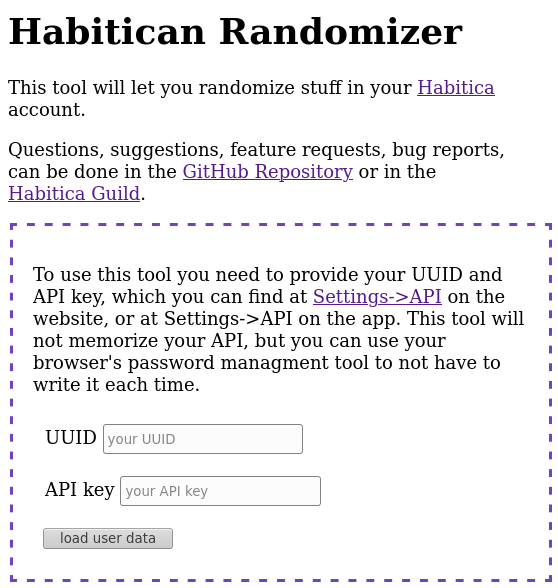 Please message @benniefolyfe for questions, suggestions, or troubleshooting. I'm happy to help! You can also submit feedback at the GitHub Repository or Habitica Randomizer Guild.