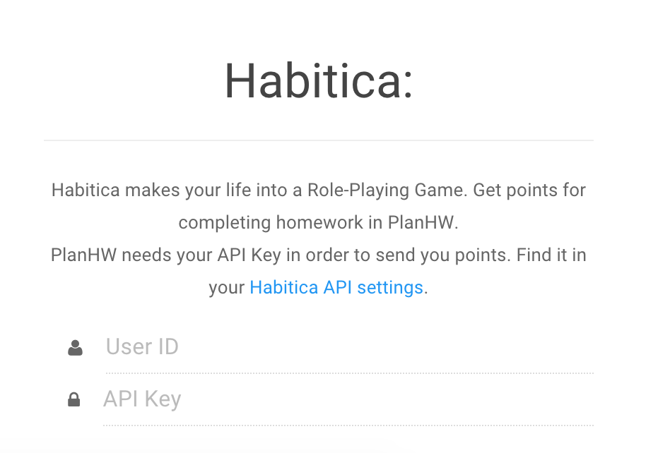 Go to the settings page and enter your User ID and API key in the profile section!Linking your Habitica account to PlanHW