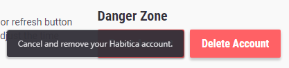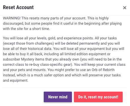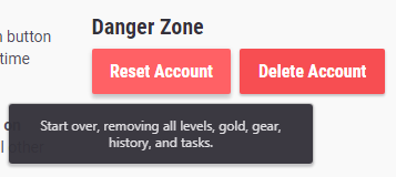 Approach with caution. The settings in this area have drastic and permanent effects on your Habitica account. Avoid this area unless you want to perform one of these actions - they cannot be undone once performed.