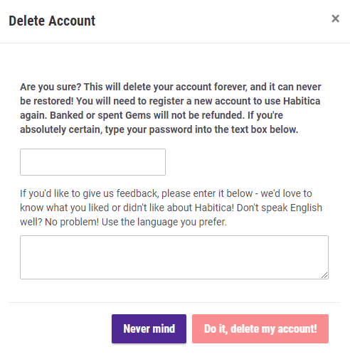"Are you sure? This will delete your account forever, and it can never be restored! You will need to register a new account to use Habitica again. Banked or spent Gems will not be refunded. If you're absolutely certain, type your password/DELETE