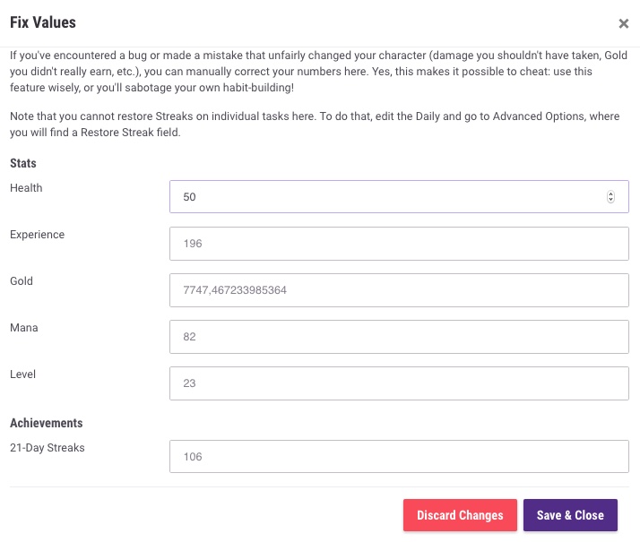 Manually change values like health, level, mana, and gold. This can be useful if an error has affected these values or if a person is motivated by having high stats.
