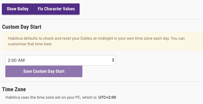 The Custom Day Start is the time of day at which one day ends and the next day begins in the player's Habitica world; the default day start is midnight in the player's time zone. (See also: Cron)
