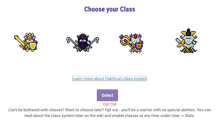 Lets you choose a Class once you reach level 10 or opt out of the Class System temporarily. Opt back in and choose a class, any time you like!