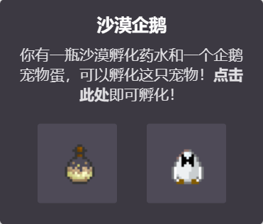 - 孵化一只宠物,需要一个蛋和一瓶孵化药水(无法孵化的特殊宠物除外)。
