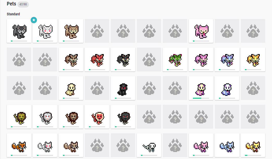 多亏了驯兽师Matt打理,你可以在宠物标签页下看到排列整齐的宠物们:宠物会按物种分行、按品系分列。未孵化的宠物会显示为爪印。驯兽师Matt还关注着你的“驯兽大师”成就的进度,为你的宠物收集情况计数。