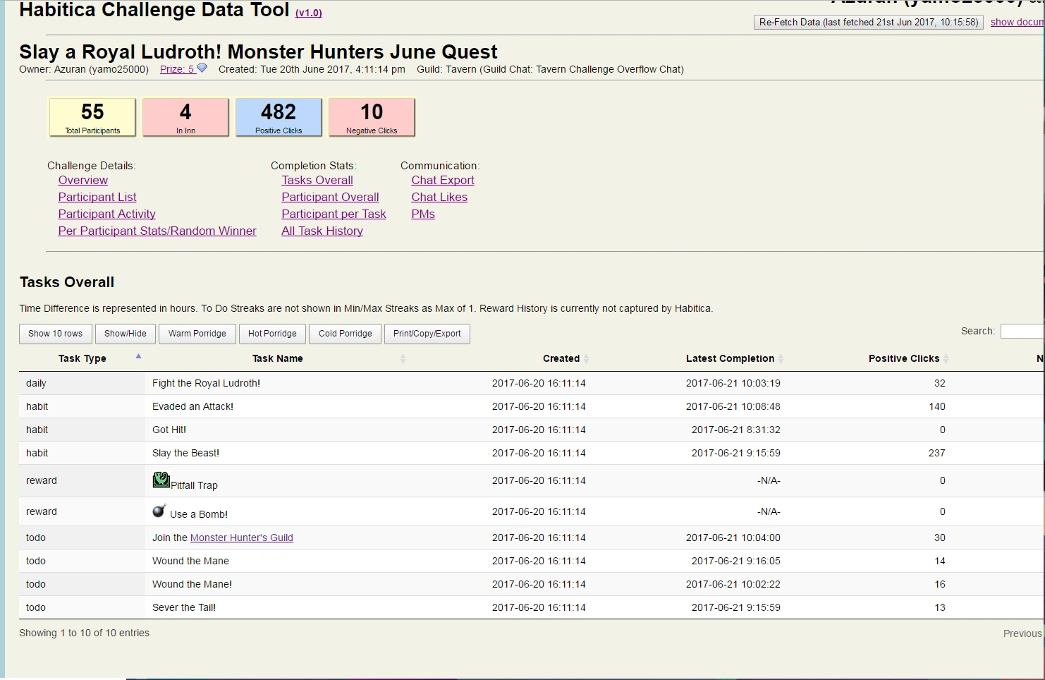 这是一个帮助你分析挑战的工具。使用挑战数据工具可以查看所有挑战参与者,分析他们点击/完成任务的频率,导出聊天记录(包含或不包含队伍系统消息),选择获胜者等等。如果你是挑战发起者,那么你可以使用此工具给参与者批量发送私信、赠送宝石或结算挑战奖励。如果你不是发起者,只是一名参与者,那么你可以通过此工具给挑战的组织者发送消息。你可以导出以下格式:Excel、CSV、PDF,以及复制或打印结果。有关其他文档,请参阅挑战数据工具网页的文档(Documentation)区域。