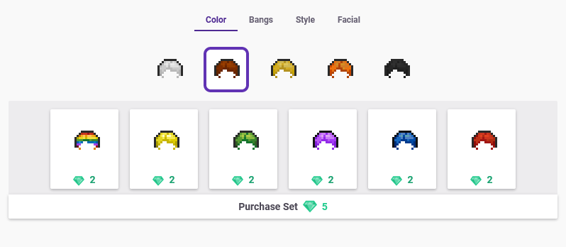 - 发型和发色 修改发型和发色,也可以添加胡子或刘海。一共有五种默认发色、四种默认刘海以及两种默认发型——其他发型发色需用宝石购买。