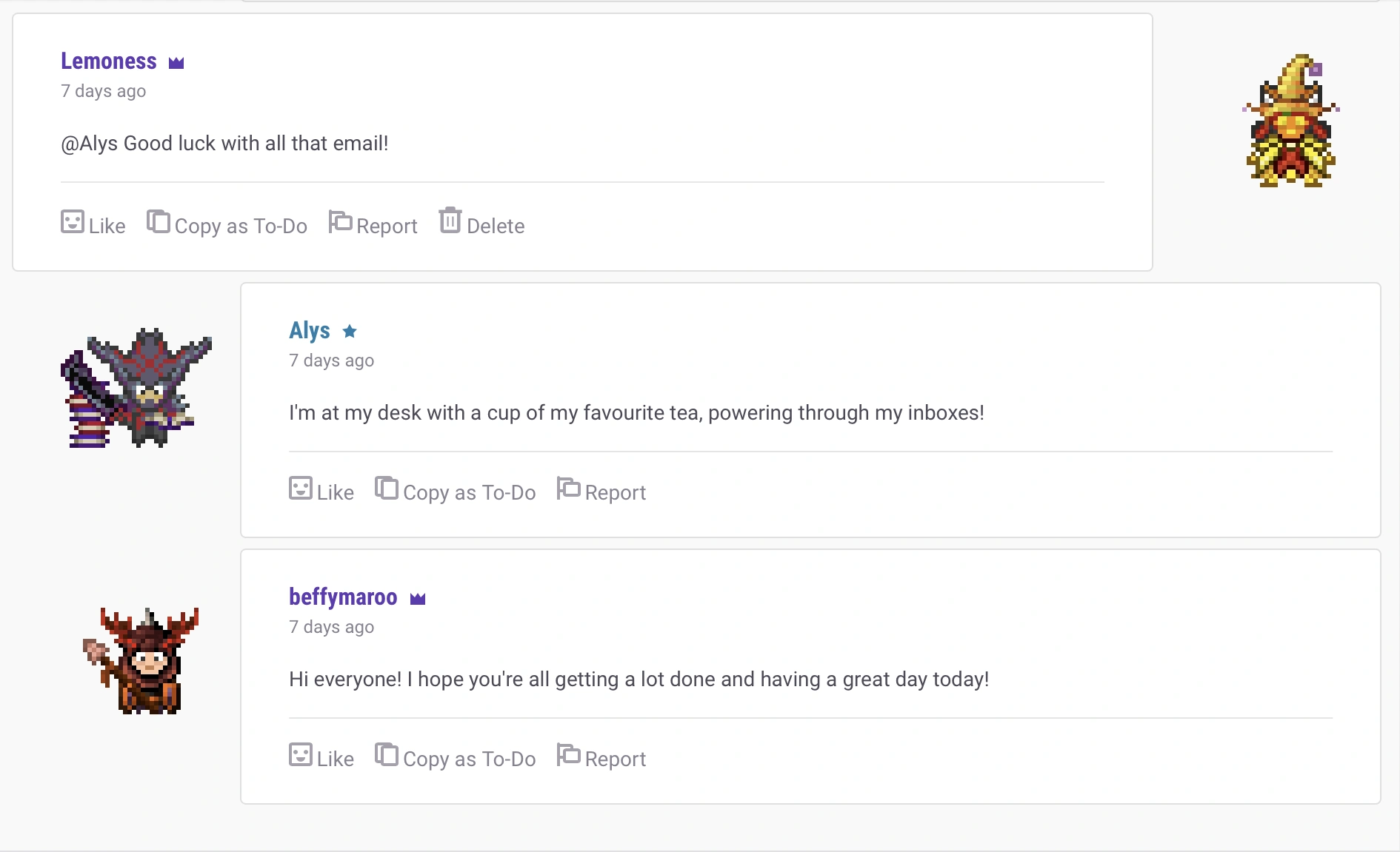 在默认情况下,Habitica不允许你从上次中断的地方来继续阅读。唯一的方法是使用浏览器的搜索功能(Control + F或Command + F)来找到你所记得最后看到的帖子。但是,在Android应用上,你每次打开公会、队伍或酒馆,都会停在你上次离开的地方,你可以看到所有未读的消息。