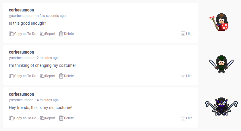 除此之外,此功能意味着,在更换外观之前,用户的旧外观仍会显示在比较旧的消息上。此外,这对角色扮演以及展示不同的外观来说非常有用,例如,外观嘉年华Costume Carnival公会成员(和其他用户)只需发送一条消息就能不断改变外观并分享外观搭配。此外,你也可以看到你之前的(和喜欢的)外观,甚至可以重新再次装备它们。