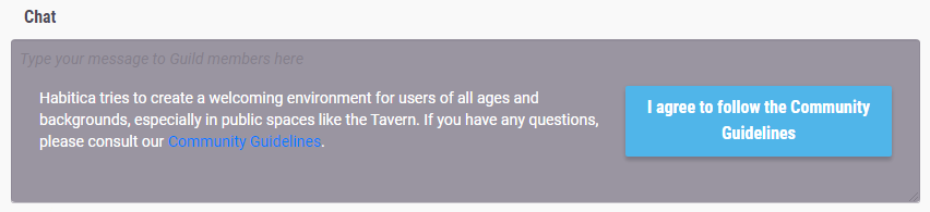 Habitica是互联网上最温暖、最亲切、最有礼貌和最愿热心帮助的社区之一。为了维持这些标准,玩家必须在参与聊天之前同意遵守社区准则(Community Guidelines)。这有助于保证社区里的每一个玩家更安全、愉快和高效率地使用Habitica。