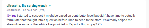 根据贡献者的福利,用户名会显示不同颜色。想要查看一个用户的状态和个人资料,只需单击对方的角色名。将鼠标悬停在贡献者的彩色的角色名上,将展示对方的奖励头衔.