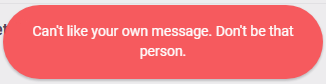 单击浅灰色的“点赞”按钮将使其变为紫色,并且计数器数字会加1。如果再次点击该紫色按钮,它将会取消点赞,并使计数器数字减少1,然后“点赞”按钮将会变回浅灰色。如果你给自己所发的消息点赞,则会收到一条提示——“不能喜欢自己的消息。不要成为那种人。”