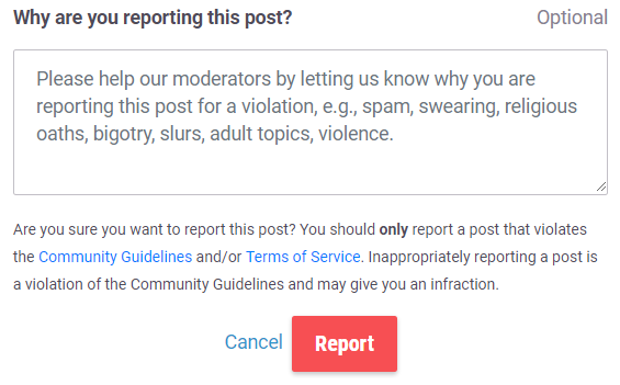 不恰当的言论可以通过消息下方的“举报”键向版主举报。之后会弹出一个窗口来询问您是否确定要举报该消息,并在评论框提供举报原因。您可以通过点击“取消”或“举报”来继续。您只可以举报违反社区准则(Community Guidelines)或服务条款(Terms of Service)的消息。被举报的消息将会自动地对其他所有非版主用户隐藏,除了当发消息的用户已得到两个标记(或得到一个来自版主的标记)。这可以帮助保证所有用户安全和愉悦地使用Habitica。通常,当一个消息被隐藏后,一位版主将会发出有关被举报消息的消息,来告知发布该消息的人该消息已向其他人隐藏。因为发布被举报消息的人能够看到版主所发的消息,他们可以复制原消息并对其进行必要的修改,再重新发出。