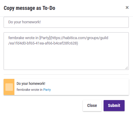你可以复制一条聊天消息,将其从酒馆、公会或队伍中的任何聊天中自动添加到你的“待办事项”列表中。