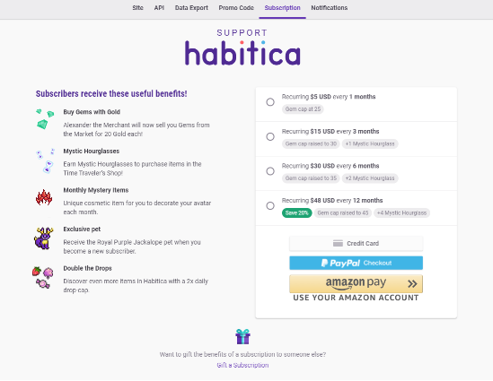 在网页版Habitica中,通过点击工具栏中的宝石图标或者点击用户头像下的订阅按钮,用户可以进入订阅页面。Habitica接受Paypal、亚马逊、Stripe支付(信用卡直接支付)。选择一种支付方式,按照指示提交支付信息,即可完成支付。