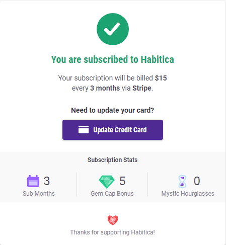 订阅费用为每月5美元,用户可选择单月、季度、半年及全年的订阅套餐。全年套餐订阅用户可享受20%的折扣,即每年48美元(每月4美元)。Habitica手机应用会为用户显示实时汇率以便订阅,汇率标准参照Apple或谷歌商店。