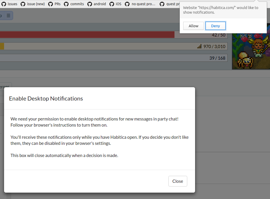 你可以选择接收队伍聊天的桌面通知。如果这样做,只要你在浏览器中打开 Habitica,你就会通过桌面通知收到新的聊天纪律。如果不允许接收桌面通知,你将获得类似于金币以及经验值格式的通知。